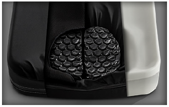A almofada Axiom SP Fluid usa bolsa de fluido Hydrolite em vez de espuma viscoelástica. A bolsa repousa diretamente sob a cobertura externa super esticada, permitindo que ela se adapte aos tecidos que sustentam as tuberosidades isquiáticas.