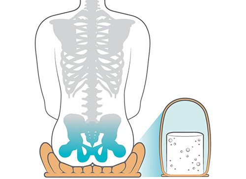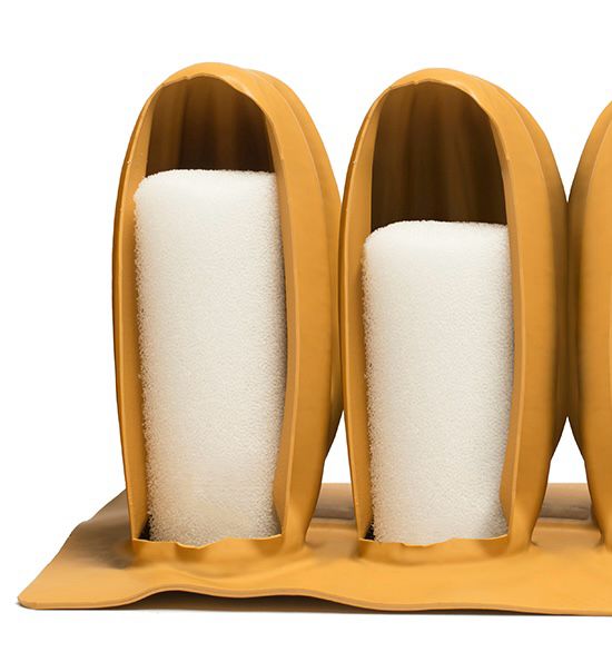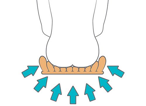 • Almofada possui dois tamanhos de cilindros de espuma. Os cilindros externos são mais altos, enquanto os abaixo das nádegas, cóccix e pernas são mais baixos, criando uma camada secundária de proteção da pele com formato anatômico. Isto aumenta a estabilidade e facilita as transferências.