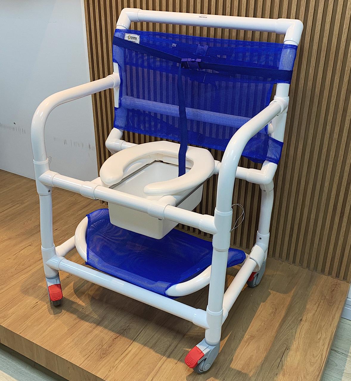 Cadeira de banho c/rodas, fabricada em PVC, vinil e tela poliéster, para uso no sanitário e chuveiro.
