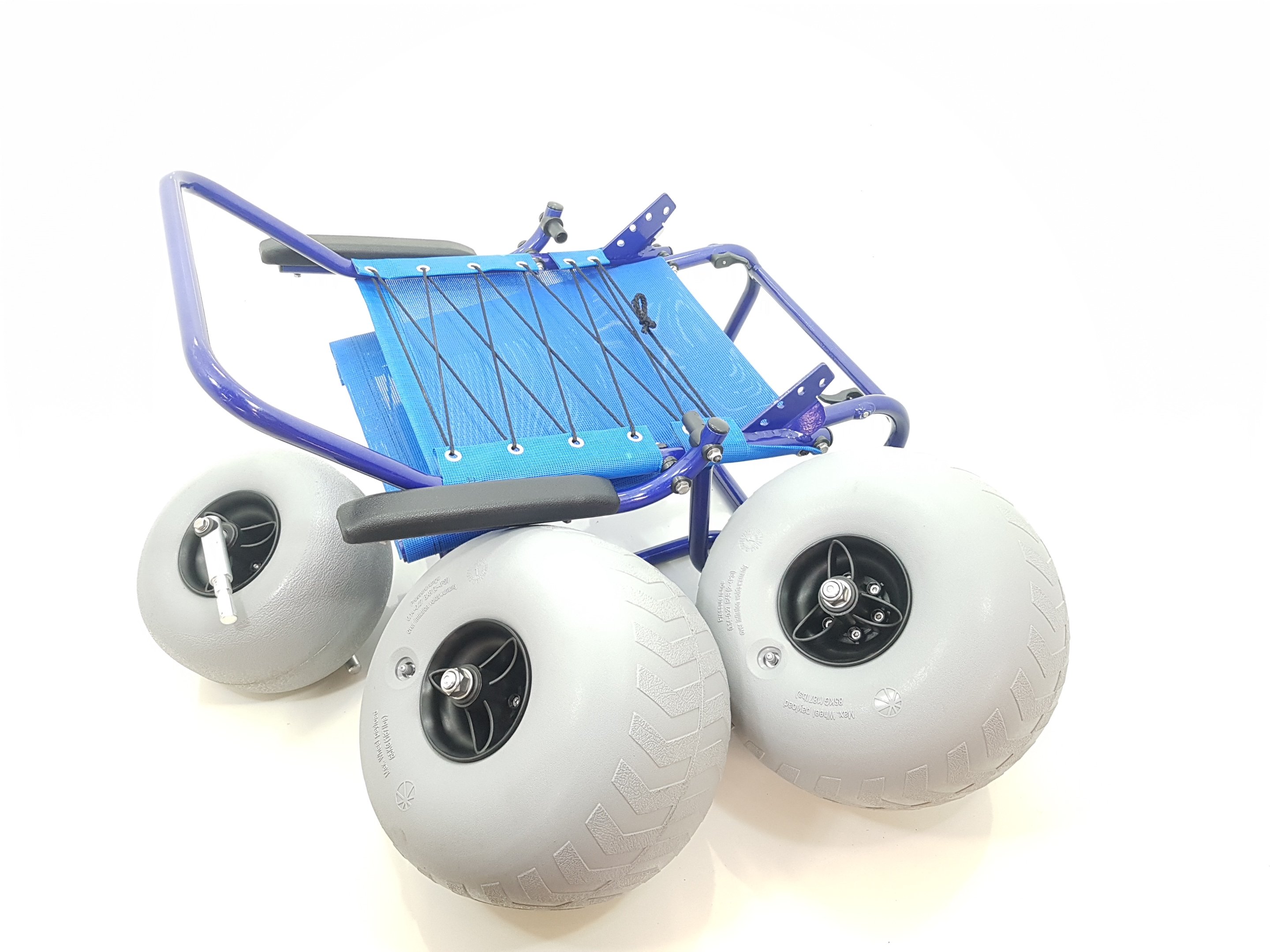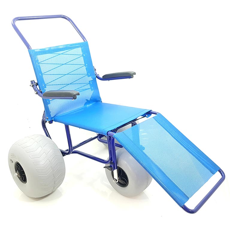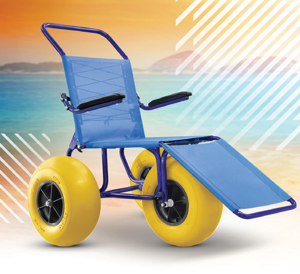 Pode ser utilizada na areia e na água. Suas rodas de perfil largo evitam que a cadeira atole e permitem realizar movimentos fáceis e leves.