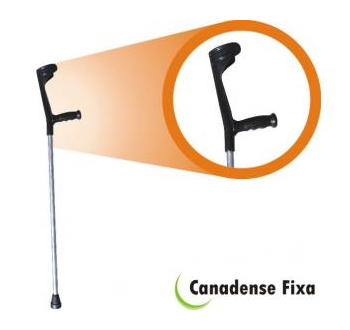 Muleta tipo Canadense marca ALO, fabricada com estrutura tubular em alumínio anodizado de alta resistência, possui regulagem de altura entre 1,00m e 1,20m.