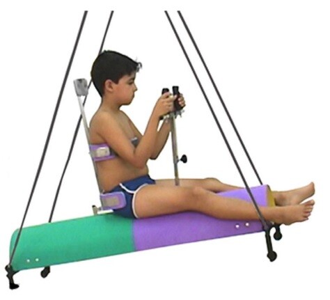 Constituído de uma chapa de aço curva, estruturado internamente por tubos de aço e forrado com eva de 3mm. Possuí 4 pés com ponteiras de borracha.Possuí uma haste de 80 cm de altura com estabilizador de cabeça, estabilizadores de quadril e tronco ajustáveis e guidão com ajustes de altura e inclinação.